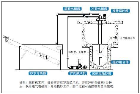 由于葉輪葉漿向上傾斜,旋轉(zhuǎn)時(shí)將使池中的污水呈螺旋狀加速,形成渦流態(tài),產(chǎn)生留心力。同時(shí)池內(nèi)污水流在葉輪葉片攪拌剪切力的作用下,互相剝離,依靠砂的自身重力和旋流的離心力,使砂粒沿池壁呈螺旋線加速沉降,向中心砂斗積聚,經(jīng)氣提或泵提升后排出池外作進(jìn)一步的處理。在此過程中,適當(dāng)?shù)臉~角度和線速度條件,使污水中的砂粒受到?jīng)_刷,并保持較佳的沉降效果,而原來粘附在砂粒上的有機(jī)物,以及重量最小的物質(zhì),隨污水一同流出旋流沉砂池,進(jìn)入后續(xù)工序繼續(xù)處理,砂與少量污水進(jìn)入池外砂水分離器內(nèi),砂經(jīng)分離后外排,污水回流至格柵井。