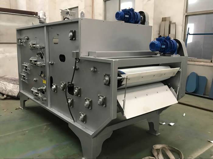 2.重力脫水階段:被絮凝的物料通過泵加到濾帶上,使絮團(tuán)之間的自由水在重力作用下與絮團(tuán)分離,逐漸使污泥絮團(tuán)的水份降低,流動(dòng)性變差。重力脫水段去除了污泥中絕大部分水份。