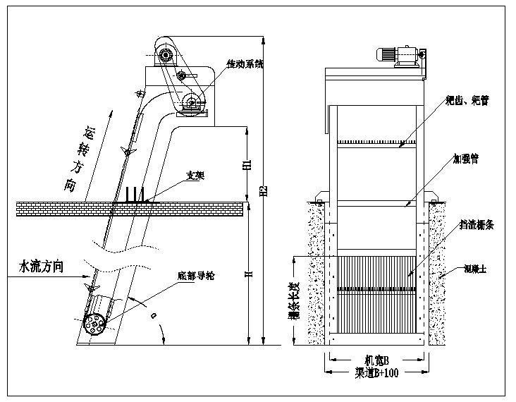 B=機(jī)寬; H=渠深; H1=出渣高度; H2=H+H1+2000; α=安裝角度。